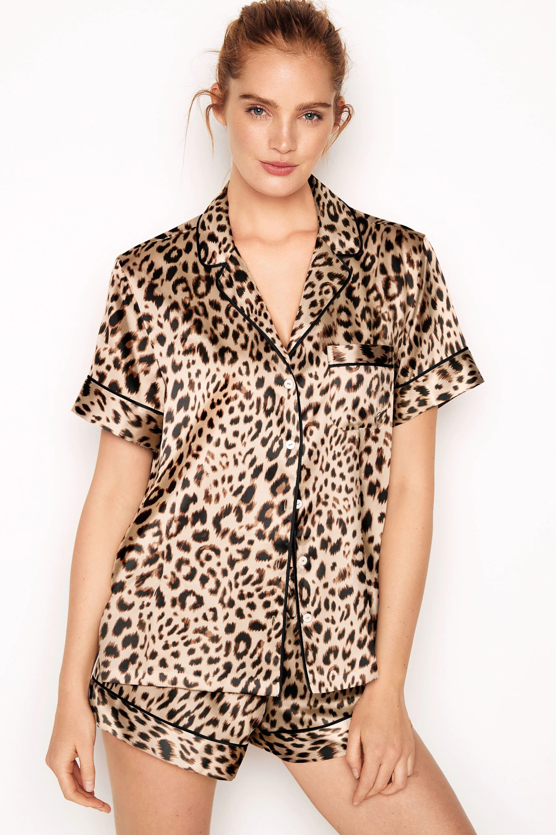 Sexy leopardo impressão contraste tubing seda pijama curto