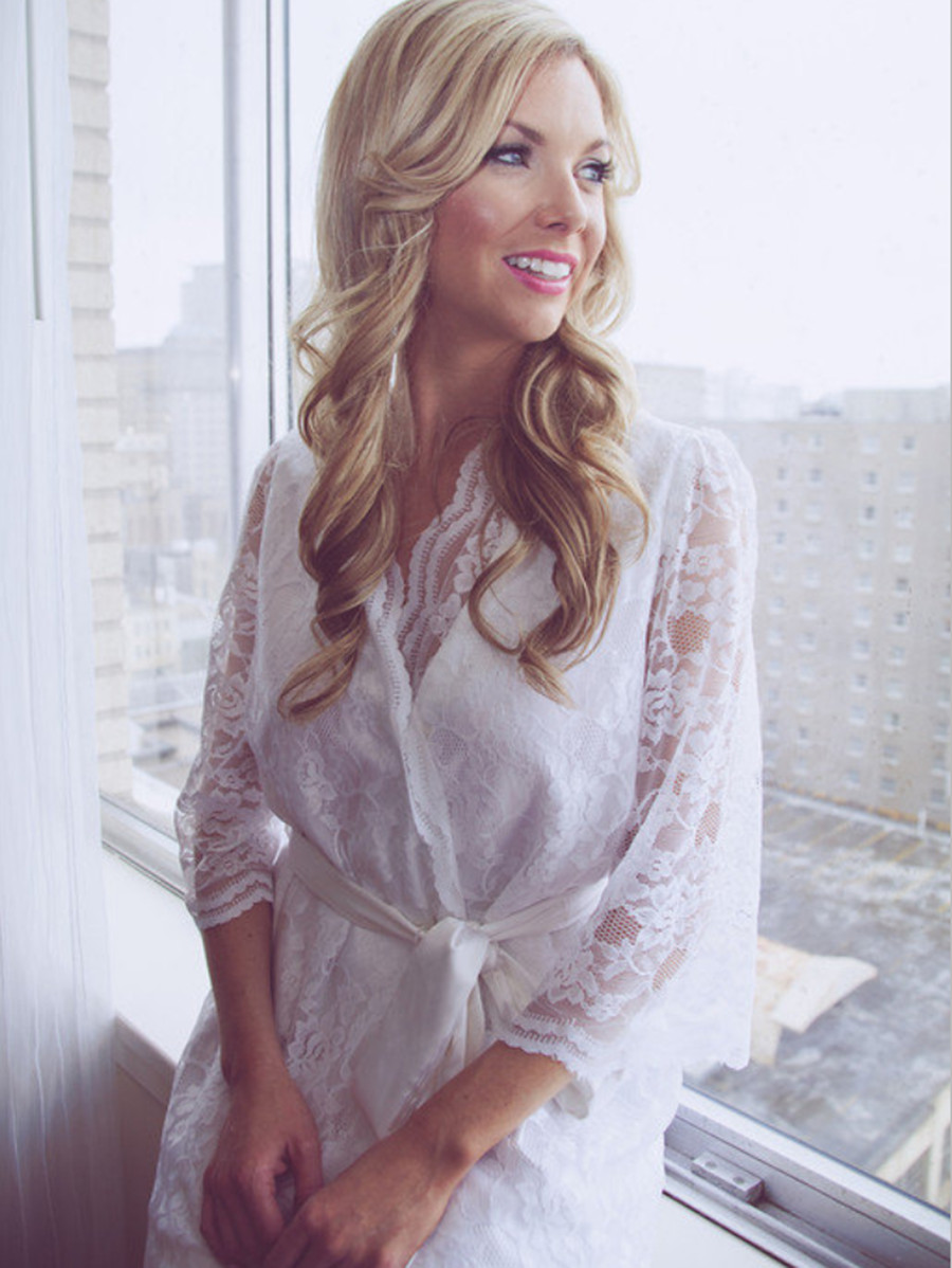 Semi-sheer white lace layed with silk satin, the robe is playful and elegant.